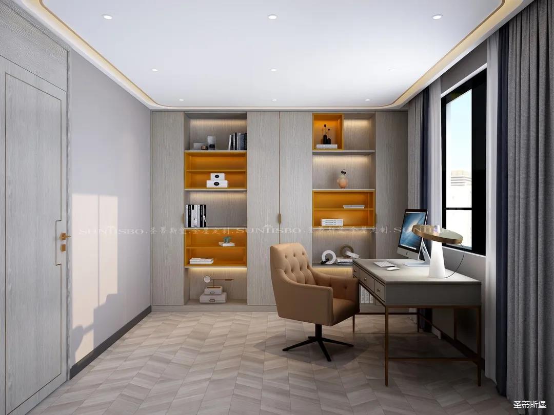 英伦仿古灰实木嵌墙书柜,结合同色系的时尚简约书桌,整个空间都被自然气息包围。由于工作原因,加班也成为了生活中的常态,简约书房设计打破了平时忙碌的生活,也为心中寻得那一方心静之地。